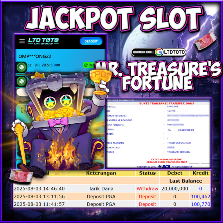 LTDTOTO JACKPOT MR.TREASURE’S RP 20.000.000 MINGGU 03 AUGUST 2025 Selamat kepada User id : OMP***ONG22 Telah berhasil mendapatkan kemenangan besar pada permainan MR.TREASURE’S FORTUNE, kemenangan Sebesar Rp.20.000.000, Setelah mengisi formulir withdraw dengan kurang waktu hanya 5 – 10 menit pihak LTDTOTO sudah melakukan transfer kepada pemilik User id dan dana sudah dapat di cairkan oleh pemenang. Bukti…