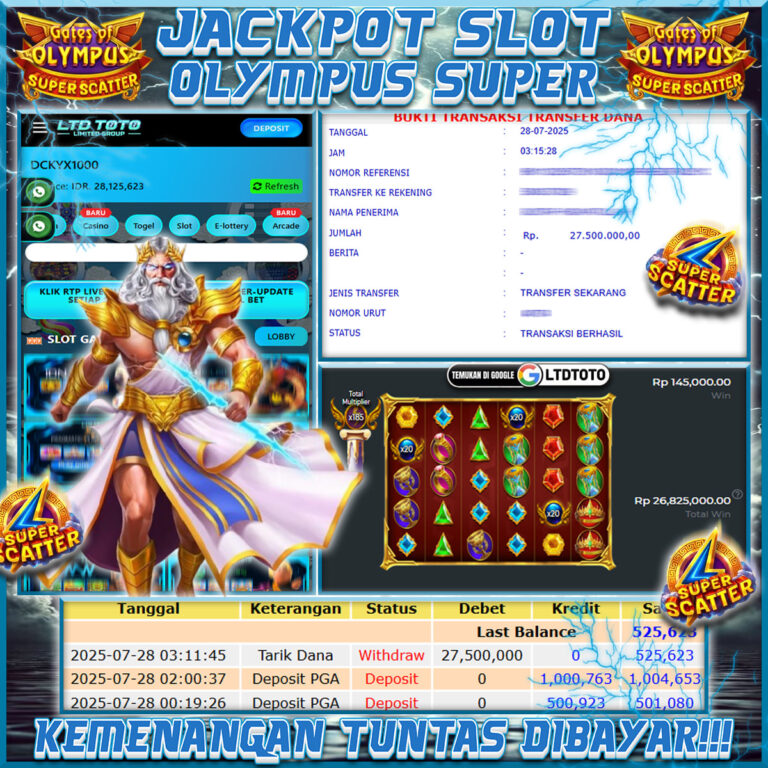 LTDTOTO JACKPOT GATES OF OLYMPUS SUPER SCATTER RP 28.000.000 SENIN 28 JULY 2025 Selamat kepada User id : DCKYX1000 Telah berhasil mendapatkan kemenangan besar pada permainan SLOT GATES OF OLYMPUS SUPER SCATTER kemenangan Sebesar RP 28.000.000, Setelah mengisi formulir withdraw dengan kurang waktu hanya 5 – 10 menit pihak LTDTOTO sudah melakukan transfer kepada pemilik User id dan dana sudah dapat di cairkan oleh…