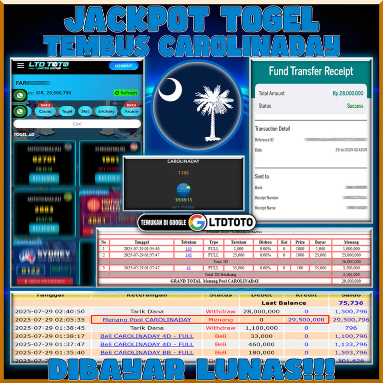 LTDTOTO JACKPOT TOGEL PASARAN CAROLINADAY RP 29.500.000 SELASA 29 JULY 2025 Selamat kepada User id : FARH***88 Telah berhasil mendapatkan kemenangan besar pada permainan TOGEL PASARAN CAROLINADAY kemenangan Sebesar RP 29.500.000, Setelah mengisi formulir withdraw dengan kurang waktu hanya 5 – 10 menit pihak LTDTOTO sudah melakukan transfer kepada pemilik User id dan dana sudah dapat di cairkan oleh pemenang. Bukti pembayaran yang…