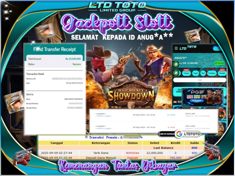 Selamat kepada User id : ANUG*A*** Telah berhasil mendapatkan kemenangan besar pada permainan WILD BOUNTY SHOWDOWN, kemenangan Sebesar Rp.22.000.000, Setelah mengisi formulir withdraw dengan kurang waktu hanya 5 – 10 menit pihak LTDTOTO sudah melakukan transfer kepada pemilik User id dan dana sudah dapat di cairkan oleh pemenang. Bukti pembayaran yang kami berikan merupakan bukti pembayaran yang SAH…
