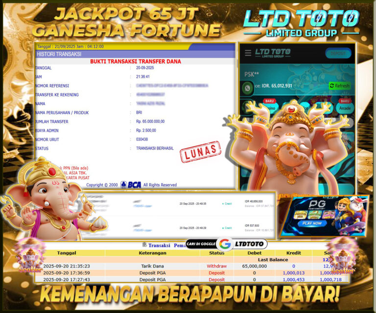 LTDTOTO JACKPOT SLOT GANESHA FORTUNE RP 65.000.000 DI BAYAR LUNAS!