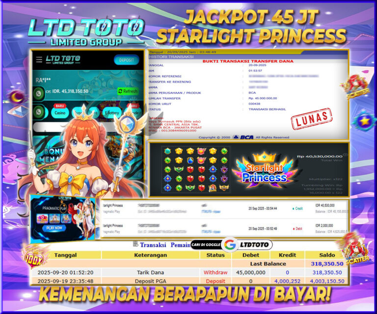 LTDTOTO JACKPOT SLOT STARLIGHT PRINCESS RP 45.000.000 SABTU 20 SEPTEMBER 2025 Selamat kepada User id : RA*I** Telah berhasil mendapatkan kemenangan besar pada permainan STARLIGHT PRINCESS , kemenangan Sebesar Rp.45.000.000, Setelah mengisi formulir withdraw dengan kurang waktu hanya 5 – 10 menit pihak LTDTOTO sudah melakukan transfer kepada pemilik User id dan dana sudah dapat di cairkan oleh pemenang….