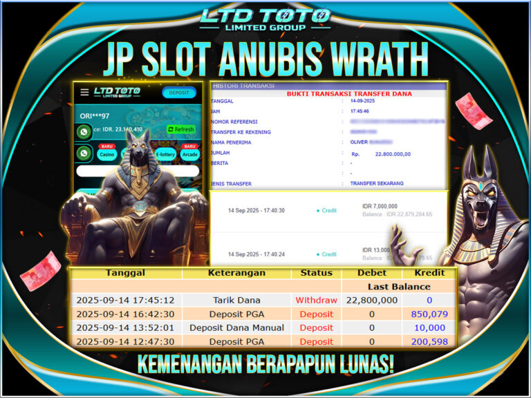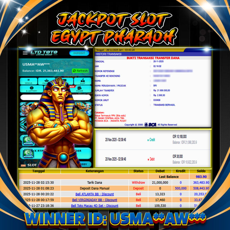 LTDTOTO JACKPOT EGYPT PHARAOH RP 21.000.000 JUM’AT 28 NOVEMBER 2025 Selamat kepada User id : USMA**AW*** Telah berhasil mendapatkan kemenangan besar pada permainan SLOT EGYPT PHARAOH , kemenangan Sebesar Rp.21.000.000, Setelah mengisi formulir withdraw dengan kurang waktu hanya 5 – 10 menit pihak LTDTOTO sudah melakukan transfer kepada pemilik User id dan dana sudah dapat di cairkan oleh…