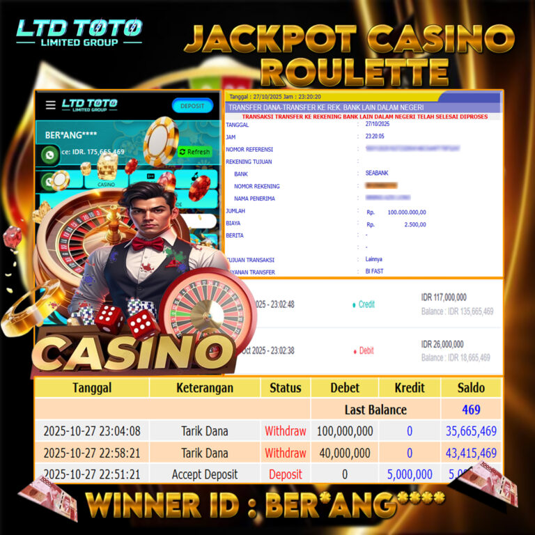 Selamat kepada User id : BE*U*NG1*** Telah berhasil mendapatkan kemenangan besar pada permainan ROULLETE, kemenangan Sebesar Rp.100.000.000, Setelah mengisi formulir withdraw dengan kurang waktu hanya 5 – 10 menit pihak LTDTOTO sudah melakukan transfer kepada pemilik User id dan dana sudah dapat di cairkan oleh pemenang. Bukti pembayaran yang kami berikan merupakan bukti pembayaran yang SAH / VALID…
