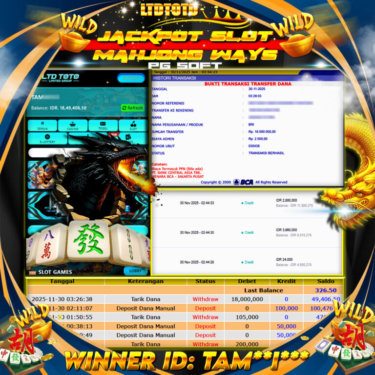LTDTOTO JACKPOT MAHJONG WAYS RP 18.000.000 MINGGU 30 NOVEMBER 2025 Selamat kepada User id : TAM**I*** Telah berhasil mendapatkan kemenangan besar pada permainan SLOT MAHJONG WAYS , kemenangan Sebesar Rp.18.000.000, Setelah mengisi formulir withdraw dengan kurang waktu hanya 5 – 10 menit pihak LTDTOTO sudah melakukan transfer kepada pemilik User id dan dana sudah dapat di cairkan oleh…