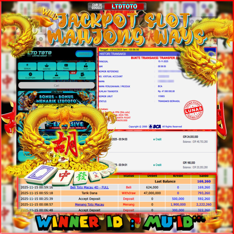 LTDTOTO JACKPOT MAHJONG WAYS RP 47.000.000 SABTU 15 NOVEMBER 2025 Selamat kepada User id :MU*ID*** Telah berhasil mendapatkan kemenangan besar pada permainan SLOT MAHJONG WAYS , kemenangan Sebesar Rp.47.000.000 , Setelah mengisi formulir withdraw dengan kurang waktu hanya 5 – 10 menit pihak LTDTOTO sudah melakukan transfer kepada pemilik User id dan dana sudah dapat di cairkan…