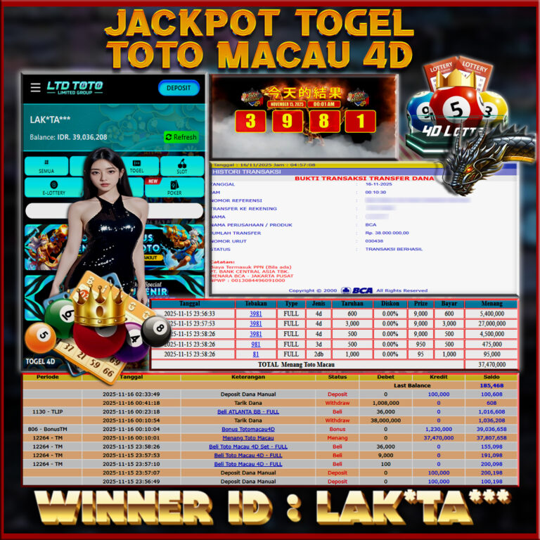 LTDTOTO JACKPOT TOTO MACAU RP 38.000.000 MINGGU 16 NOVEMBER 2025 Selamat kepada User id :LAK*TA*** Telah berhasil mendapatkan kemenangan besar pada permainan TOGEL TOTO MACAU , kemenangan Sebesar Rp.38.000.000 , Setelah mengisi formulir withdraw dengan kurang waktu hanya 5 – 10 menit pihak LTDTOTO sudah melakukan transfer kepada pemilik User id dan dana sudah dapat di cairkan…
