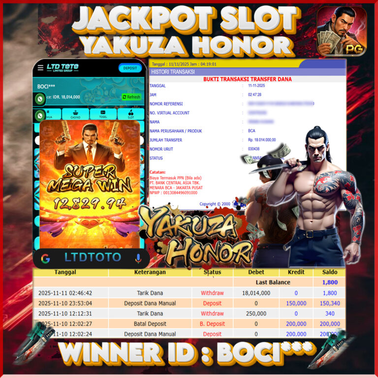 LTDTOTO JACKPOT YAKUZA HONOR RP 18.014.000 SELASA 11 NOVEMBER 2025 Selamat kepada User id : BOCI*** Telah berhasil mendapatkan kemenangan besar pada permainan SLOT YAKUZA HONOR , kemenangan Sebesar Rp.18.014.000 , Setelah mengisi formulir withdraw dengan kurang waktu hanya 5 – 10 menit pihak LTDTOTO sudah melakukan transfer kepada pemilik User id dan dana sudah dapat di cairkan…