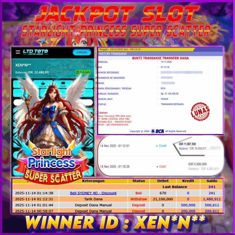 LTDTOTO JACKPOT STARLIGHT PRINCESS SUPER SCATTER RP 21.100.000 JUM’AT 14 NOVEMBER 2025 Selamat kepada User id : XEN*N** Telah berhasil mendapatkan kemenangan besar pada permainan SLOT STARLIGHT PRINCESS SUPER SCATTER , kemenangan Sebesar Rp.21.100.000 , Setelah mengisi formulir withdraw dengan kurang waktu hanya 5 – 10 menit pihak LTDTOTO sudah melakukan transfer kepada pemilik User id dan dana…