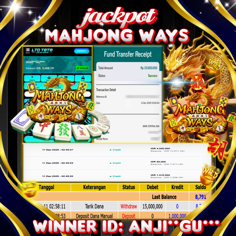 LTDTOTO JACKPOT MAHJONG WAYS RP 15.000.000 KAMIS 11 DESEMBER 2025 Selamat kepada User id : 98SA*POE*** Telah berhasil mendapatkan kemenangan besar pada permainan SLOT MAHJONG WAYS , kemenangan Sebesar Rp.15.000.000 , Setelah mengisi formulir withdraw dengan kurang waktu hanya 5 – 10 menit pihak LTDTOTO sudah melakukan transfer kepada pemilik User id dan dana sudah dapat di cairkan…