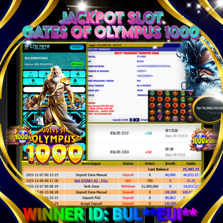 LTDTOTO JACKPOT GATES OF OLYMPUS 1000 RP 21.000.000 MINGGU 07 DESEMBER 2025 Selamat kepada User id : BUL**EUI** Telah berhasil mendapatkan kemenangan besar pada permainan SLOT GATES OF OLYMPUS 1000 , kemenangan Sebesar Rp.21.000.000 , Setelah mengisi formulir withdraw dengan kurang waktu hanya 5 – 10 menit pihak LTDTOTO sudah melakukan transfer kepada pemilik User id dan dana…