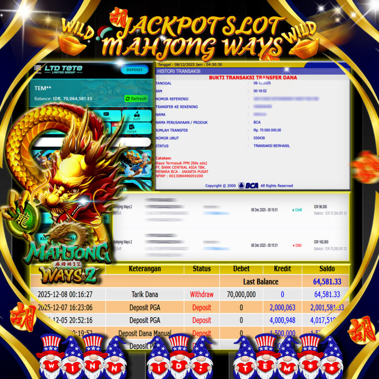 LTDTOTO JACKPOT MAHJONG WAYS 2 RP 70.000.000 SENIN 08 DESEMBER 2025 Selamat kepada User id : TEM** Telah berhasil mendapatkan kemenangan besar pada permainan SLOT MAHJONG WAYS 2 , kemenangan Sebesar Rp.70.000.000 , Setelah mengisi formulir withdraw dengan kurang waktu hanya 5 – 10 menit pihak LTDTOTO sudah melakukan transfer kepada pemilik User id dan dana sudah dapat…