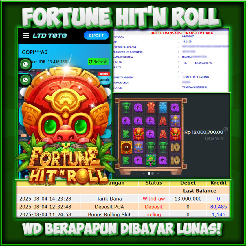 LTDTOTO JACKPOT FORTUNE HIT’N ROLL RP 13.000.000 SENIN 04 AUGUST 2025