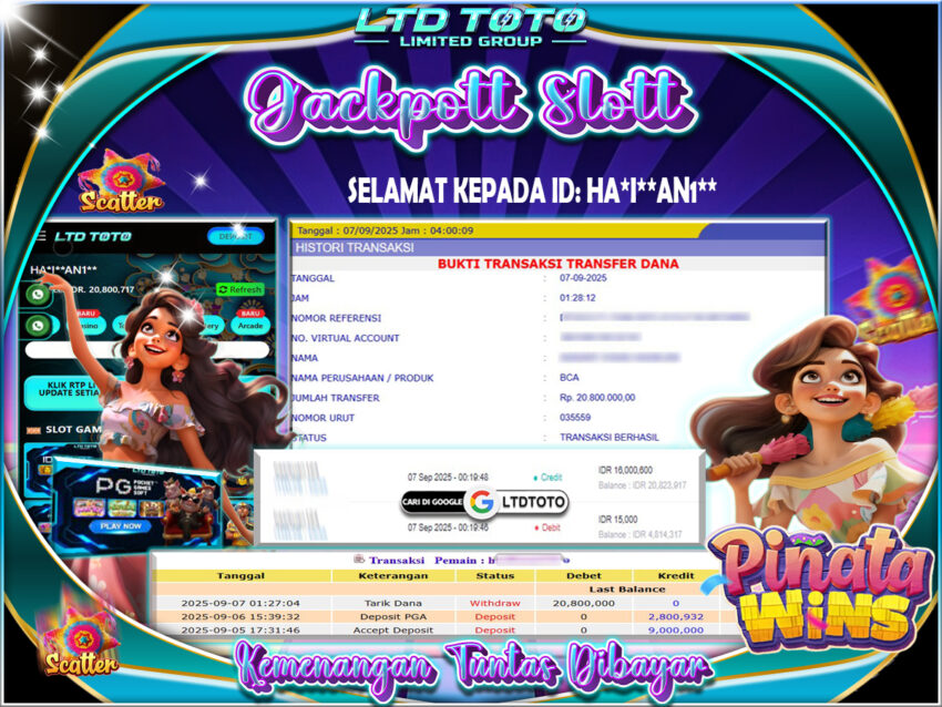 Selamat kepada User id : HA*I**AN1** Telah berhasil mendapatkan kemenangan besar pada permainan PINATA WINS, kemenangan Sebesar Rp.20.800.000, Setelah mengisi formulir withdraw dengan kurang waktu hanya 5 – 10 menit pihak LTDTOTO sudah melakukan transfer kepada pemilik User id dan dana sudah dapat di cairkan oleh pemenang. Bukti pembayaran yang kami berikan merupakan bukti pembayaran yang SAH / VALID yang langung di dapatkan melaui tanda transfer transaksi dari Bank yang di tuju. Kami mengucapakan banyak Terima Kasih Kepada pemenang karena sudah mempercayakan kami sebagai Bandar Tepercaya yang membayar semua kemenangan member hingga lunas. Masih ragu dengan LTDTOTO bos ? Di mana bandar togel online sekarang yang terpercaya seperti LTDTOTO? Bandar yang mengirimkan kemenangan member tanpa bertele – tele. Jadi…. tidak perlu khwatir pada situs LTDTOTO karena kemenangan anda berapapun akan dibayarakan hingga lunas kepada pemenang.